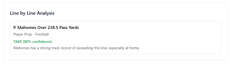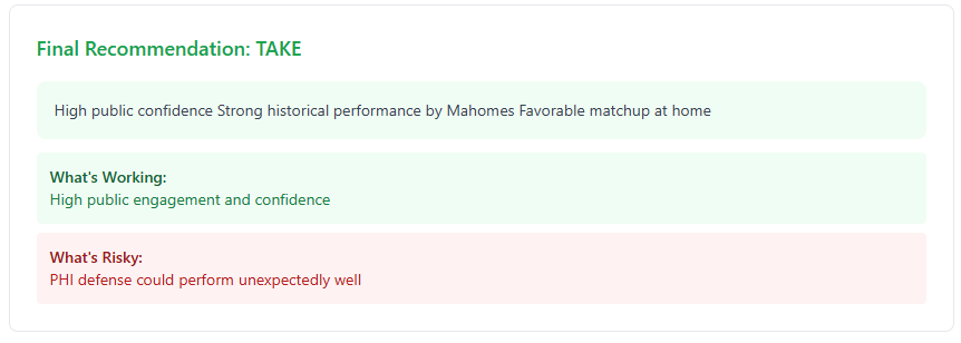 At 80% confidence and with strong public endorsement, betting Patrick Mahomes over 238.5 passing yards is a smart “TAKE” for Week 2. The prop balances reward and reasonable risk in a game poised for aerial fireworks, supported by reliable historical data and matchup advantages. Tactically monitor injury and weather factors, but let the MVP magic steer this bet.